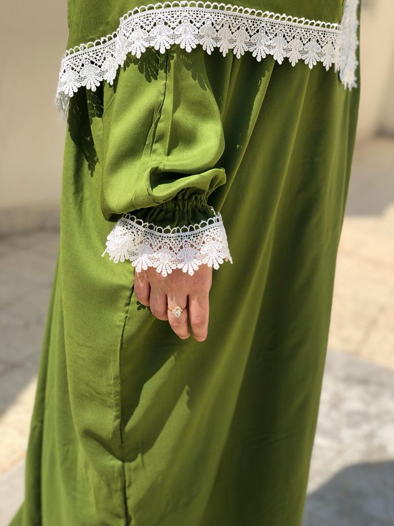 Couleur lumineuse pour le teint, la qualité et l la dentelle est très belle et rajoute une touche d’élégance à la robe de prière.