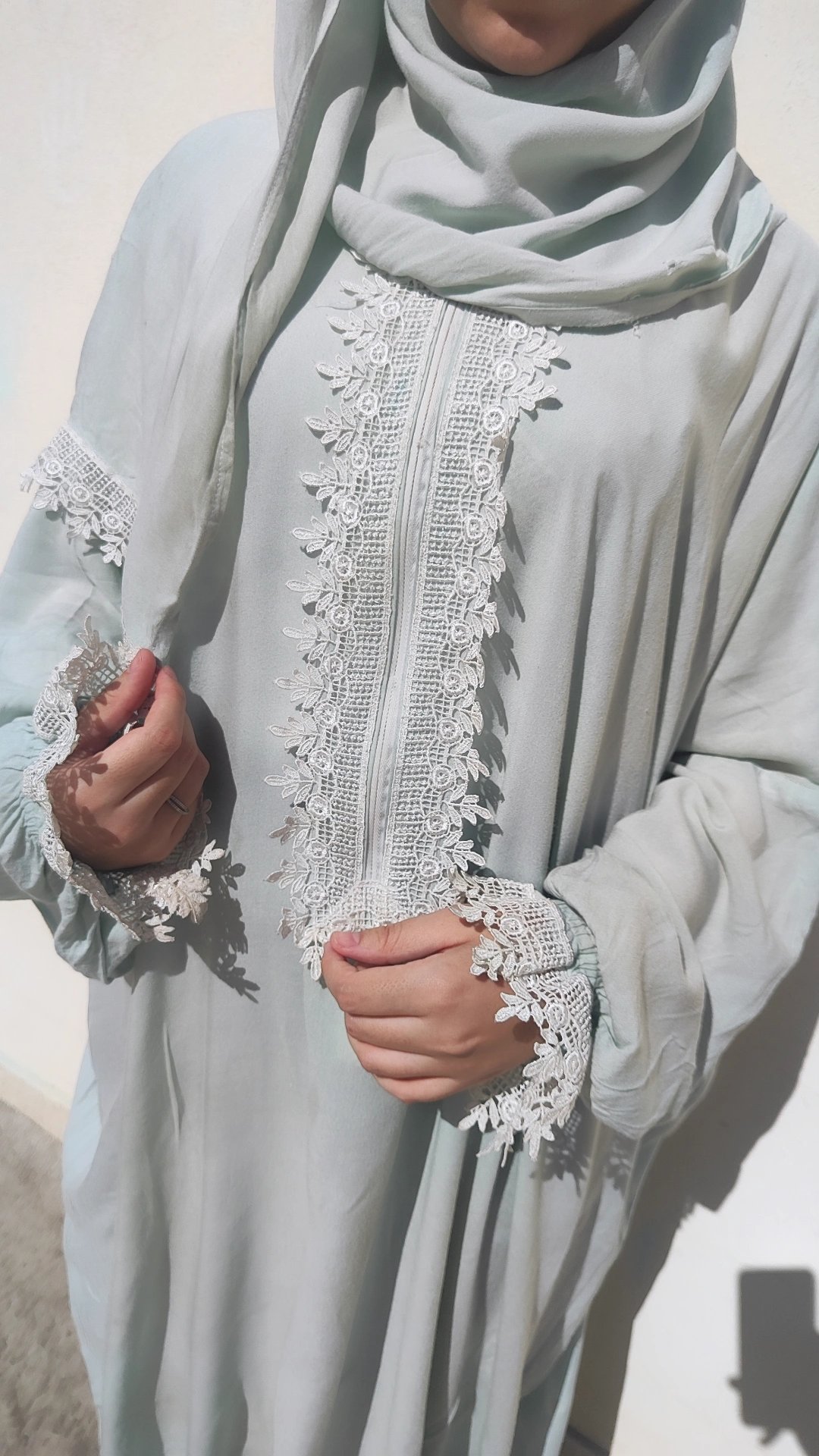 Cette tenue de prière est en coton, tissu léger et agréable. La jolie dentelle présente sur les manches, le voile ainsi qu’au niveau de la poitrine vous fera vous faire sentir belle pour votre salât.