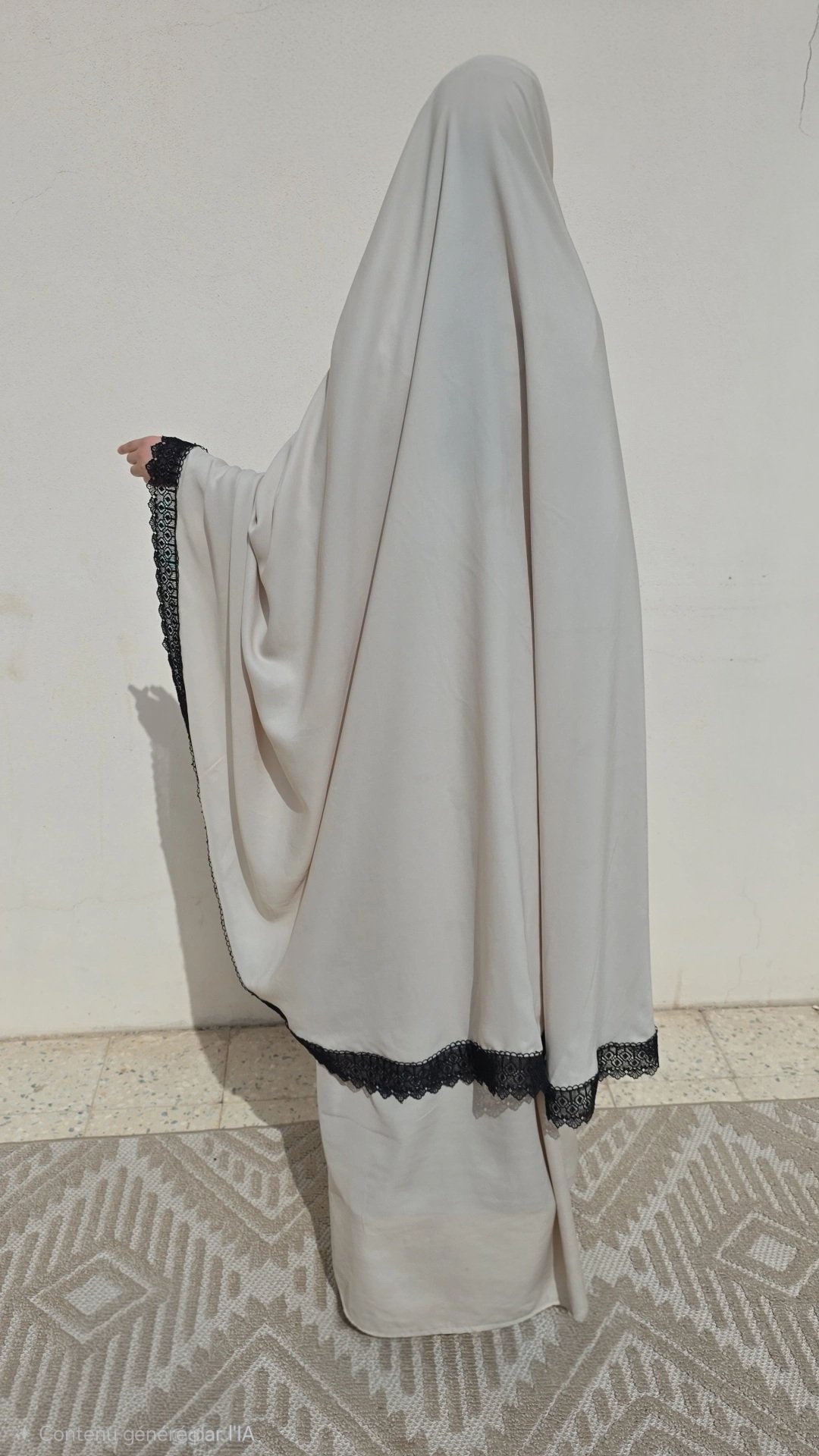 Dimensions : la jupe mesure environ 1m10 et le khimar environ 1m35 à l’arrière